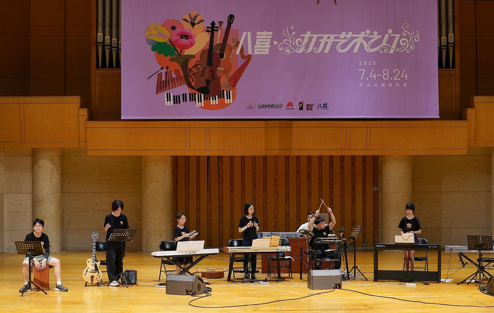 今年是中山公园音乐堂“打开艺术之门”暑期艺术节举办“小小作曲家·音乐创作夏令营”的第四年,“Cool玩乐队·器乐合奏夏令营”则是第一年开设,吸引了不少青少年参与。玩转多种乐器的少年萌生自己写歌的想法,享受自己在舞台中央的光环;弹电吉他的小姑娘一脸酷酷的表情,渴望与同伴组乐队。别看这些孩子大的不过十五六岁,小的只有八九岁,都展现出不同凡响的音乐创造力。