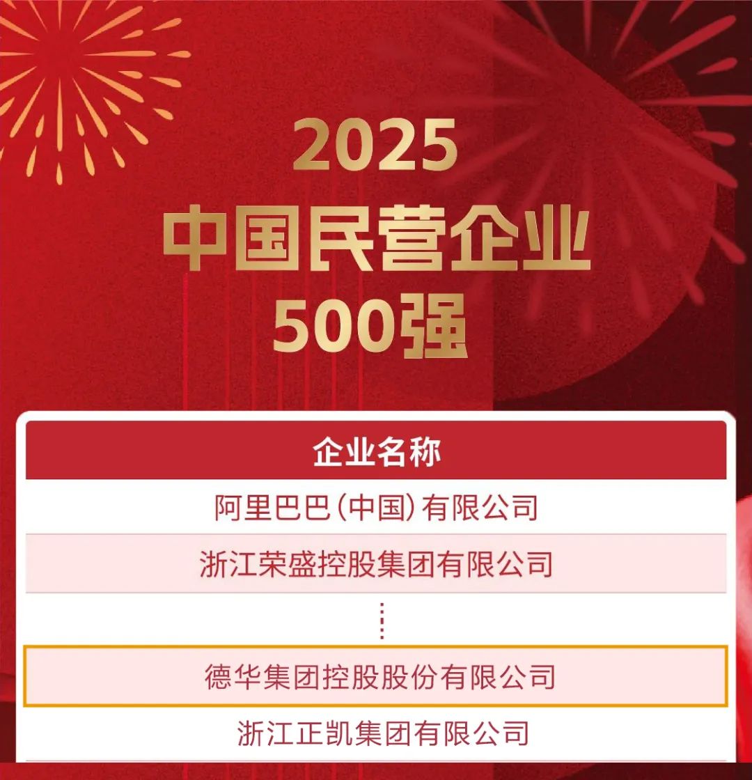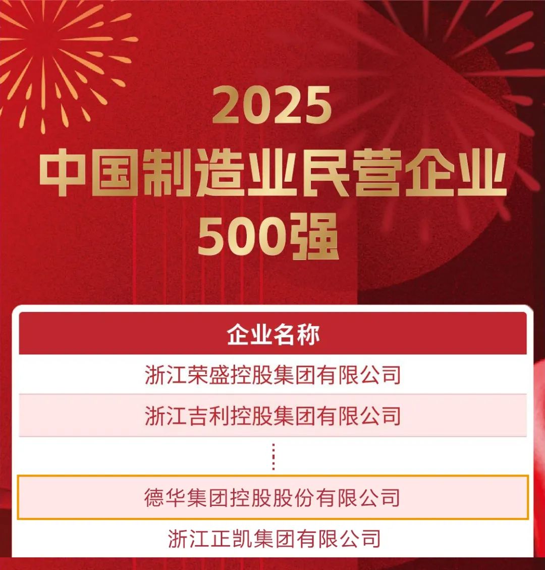 8月28日,由全国工商联主办的“2025中国民营企业500强”发布会在辽宁召开,德华集团凭借卓越表现,分别以329位和232位的排名,再次入选“中国民营企业500强”和“中国制造业民营企业500强”榜单。